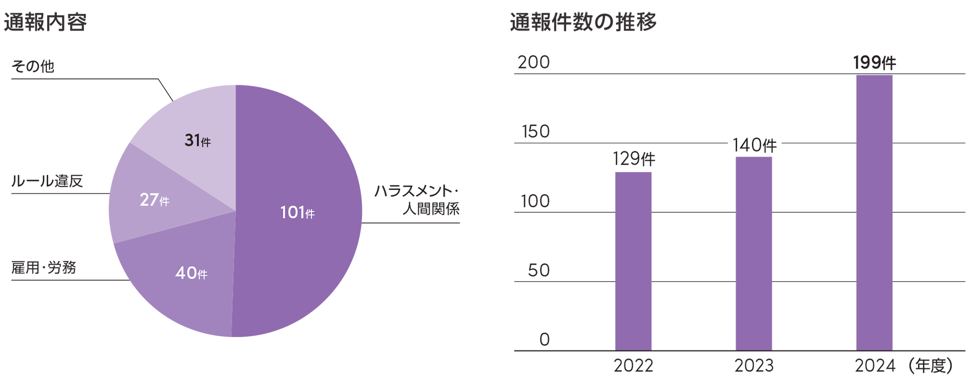 2024年度は、コンプライアンス全般、個人情報の適正な取り扱い、職場におけるハラスメントの防止、ビジネスと人権、内部通報制度などに関する全社員を対象とした研修を実施し、コンプライアンス意識の向上を推進しました。また、新入社員、新任管理職、コンプライアンス・リーダー、役員層など階層別の研修を実施したほか、管理職・店長向けのカスタマーハラスメント対策研修など、グループ各社のニーズを踏まえた研修を実施しました。