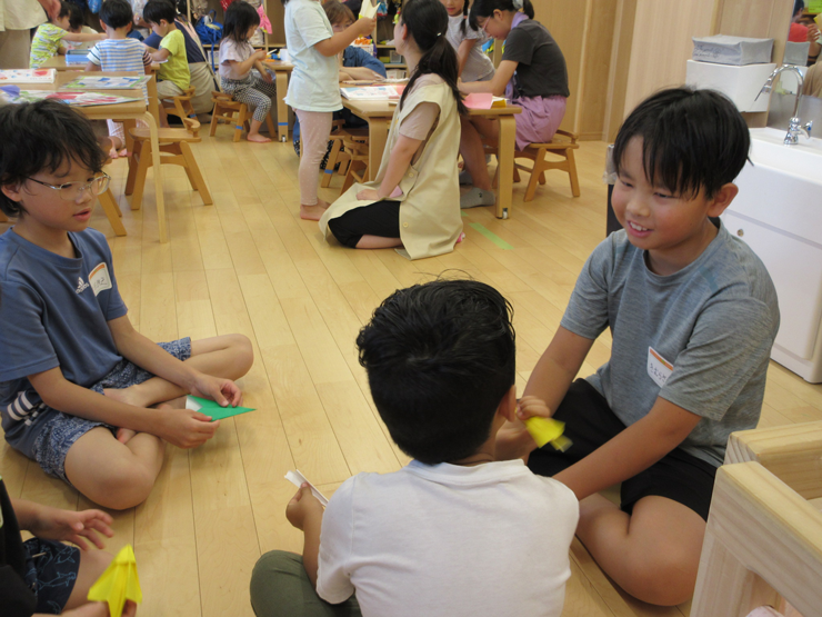 - 教室では園児と一緒にボードゲームや折り紙で遊びました。紙飛行機で誰が一番飛ばせるか競争もしました。みんなと過ごして保育士さんの体験をすることができました。