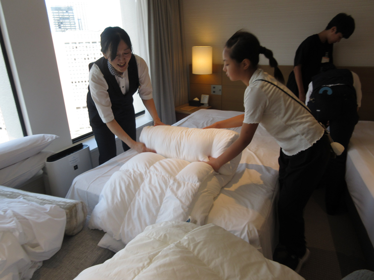 - 実際の客室でベッドメイキングをしました。思っていたよりも布団が重たくて大変でした。しわなくきれいにできたので、お家でも挑戦してみたいです。