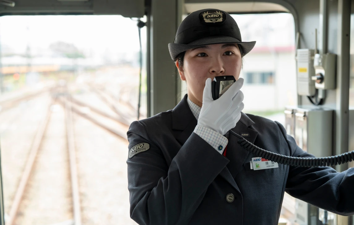 井の頭線の車掌として、渋谷駅から吉祥寺駅までの区間を、安全・正確・快適に運行することが私の仕事です。停車駅での車両ドアの開け閉め、乗り降りにともなう安全確認、運転士への出発合図などを行います。走行中も気を抜けません。停車駅や乗り換えについてのご案内を適切なタイミングで車内放送し、冷暖房の調整などにも細心の注意を払うからです。また、終着駅では進行方向が逆転するので所定の機器の取り扱いを行います。運転士と乗務位置を交代し引き続き安全運行に努めます。