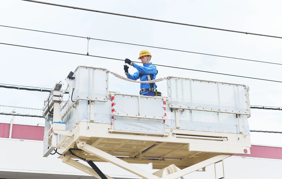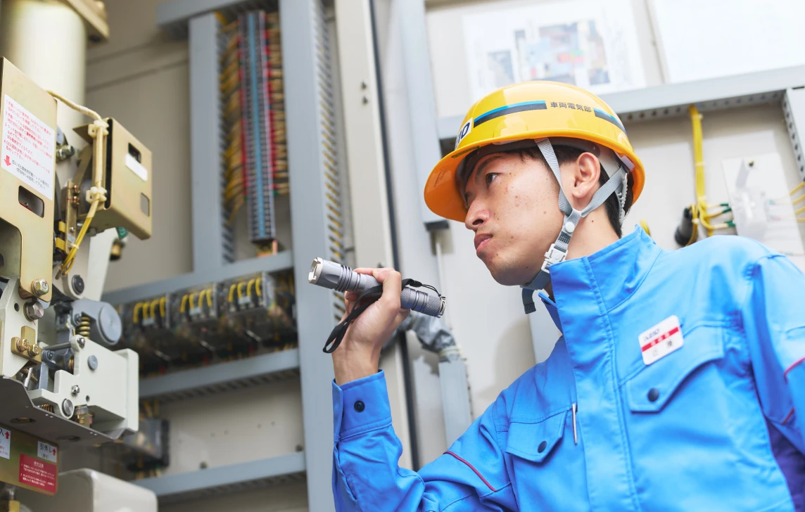 私が所属する電力管理所では、列車や駅などに電気を安定供給するための保守管理を行っています。電力会社から送られてくる電気を変換する変電所、線路上に張り巡らされた電車線やそれに関連する設備などが主な対象となります。現場に出向いて様々な点検を行い、自分たちで対応できるものは補修も行います。列車の運行中はできない作業もあるため、月に何回かは夜勤もあります。担当する区間などによって班に分かれており、班員とコミュニケーションを取りながら仕事を進めています。