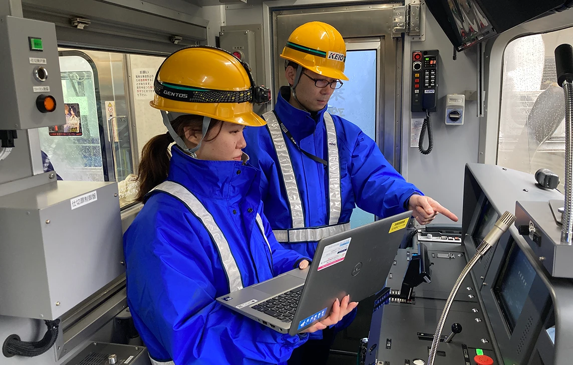 はい、そうです。少子高齢化や働き方改革を背景として鉄道にイノベーションが求められている中で、京王電鉄は乗務員の負担が少なく、安全かつ正確な電車の運行を可能にする自動運転(ワンマン運転)の実証試験を進めています。現在、井の頭線で車両改造と実証試験が行われており、将来は京王線にも拡大されていく計画となっています。車両や搭載機器のメーカー設計者と協議を重ねながら、自動運転設備を搭載する車両の設計仕様を決定することが私の担当業務です。人手不足やコスト削減などの鉄道会社としての経営課題を解決するだけでなく、鉄道インフラの維持を通して豊かな社会に貢献できる仕事なので、やりがいを感じています。友人に説明すると、「すごいね」と驚かれることも多く、その反応が非常に励みとなっています。
