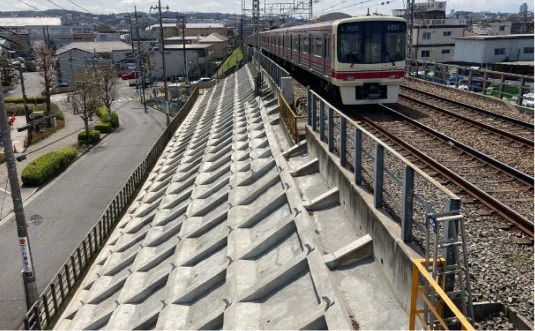 高架橋・盛土区間の耐震補強工事や線路脇法面の改修工事は、激甚化する豪雨災害や大規模地震から列車の運行を守ります。災害に強い鉄道施設が地域全体の安全を確保しています。