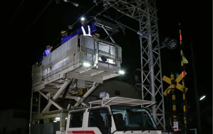 鉄道運行に必要な電力を供給する、変電所設備・電車線路設備・駅舎内電気設備などの設計・発注・保守を担います。変電所では機器類に異常がないか確認しています。また、パンタグラフに電気を送り届けている電車線については、総合高速検測車(DAX)による各種測定や架線作業車による点検・補修作業も実施しています。